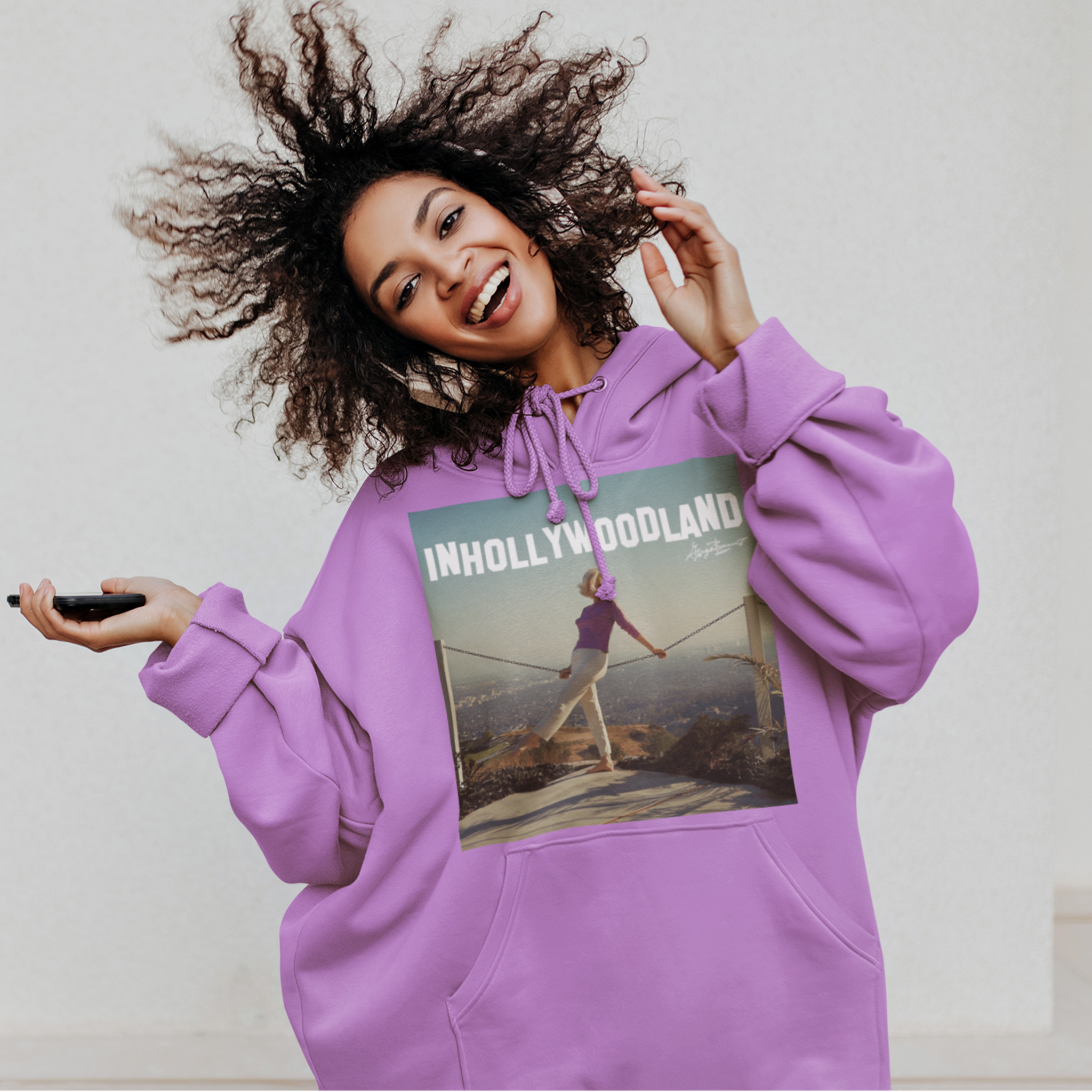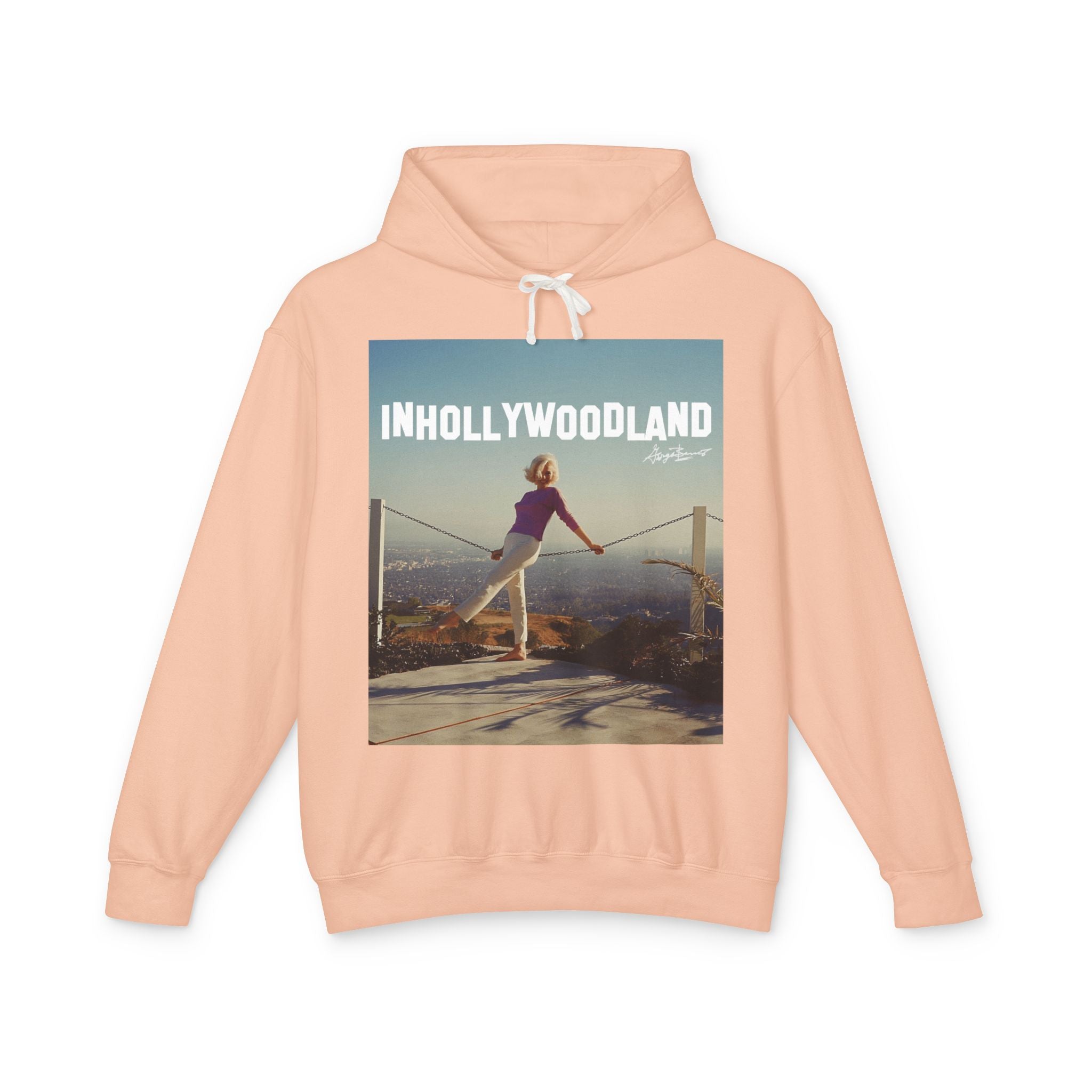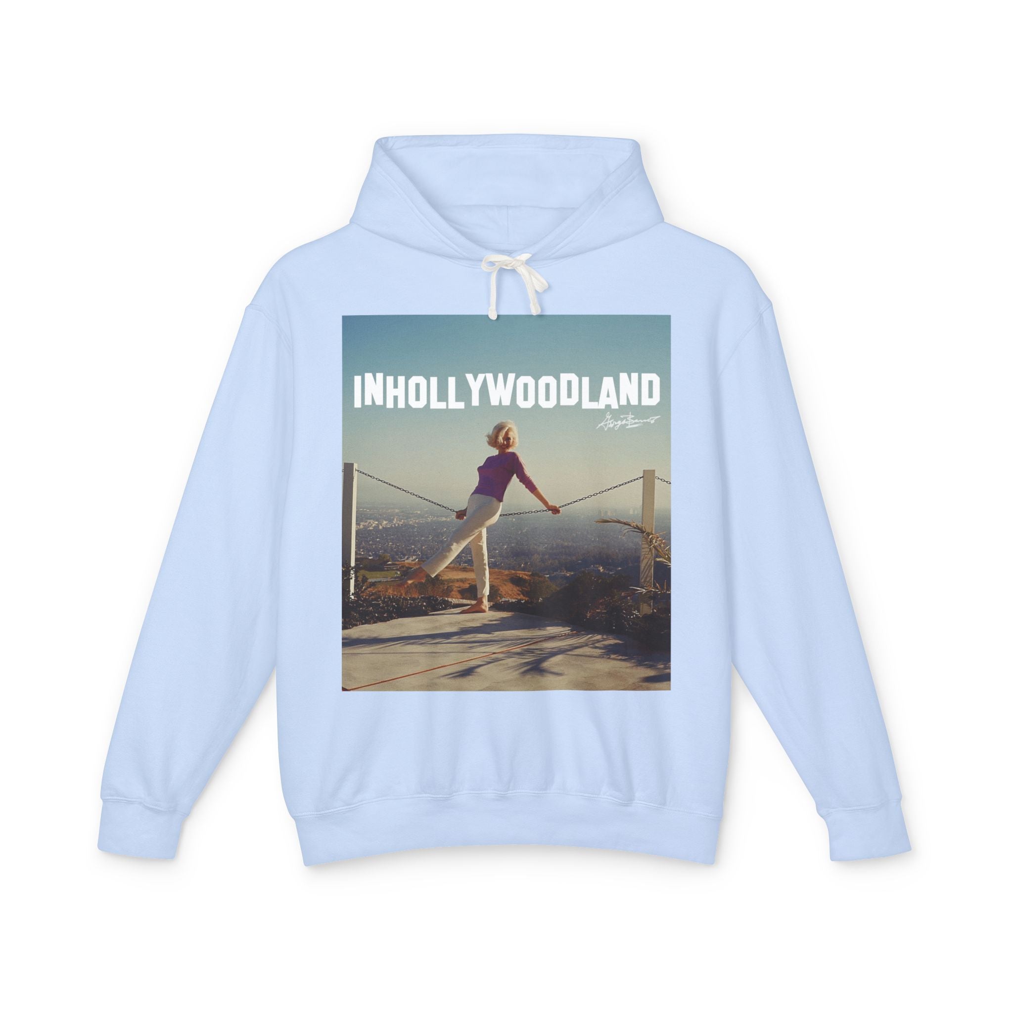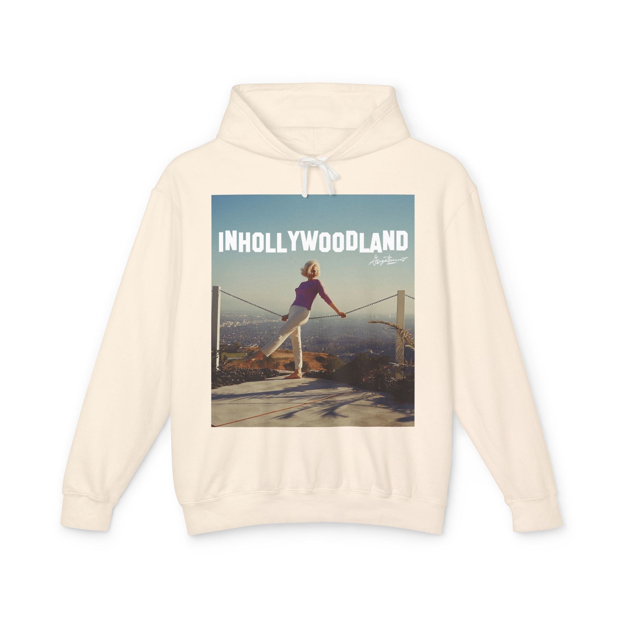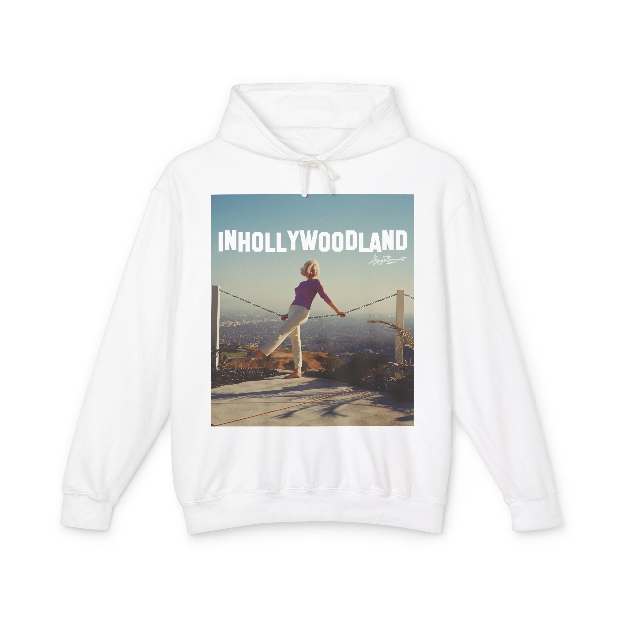 Marilyn Monroe pullover hoodie featuring the iconic Hollywood Hills photograph by George Barris in 1962. This vintage hoodie is a wearable art piece that celebrates Monroe's legacy and the magic of Los Angeles. Perfect for fans of classic cinema and retro hoodies, this piece offers both comfort and nostalgia, making it a collectible item.